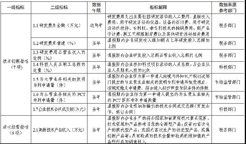 创新积分核心指标共涵盖3类一级指标18个二级指标(见附1)。第一类是技术创新指标。该类指标衡量企业在创新研发方面的投入以及最终创新结果,具体包括研发费用金额、研发费用增速、研发费用占营业收入的比例、科技人员占职工总数的比重、与主营业务相关的发明专利申请量、与主营业务相关的PCT专利申请量、企业技术合同成交额等7个指标。第二类是成长经营指标。该类指标衡量企业长期可持续的成长经营能力,具体包括高新技术产品收入、营业收入、营业收入增长率、研究生以上人员占比、研发费用加计扣除所得税减免额、净资产利润率等6个指标。第三类是辅助指标。该类指标对企业创新能力进行补充评价,具体包括吸纳应届毕业生人数、承担建设省级及以上研发或创新平台数量、获得省级及以上科技奖励数量、承担省级及以上科技计划项目数量、获得风险投资金额等5个指标。