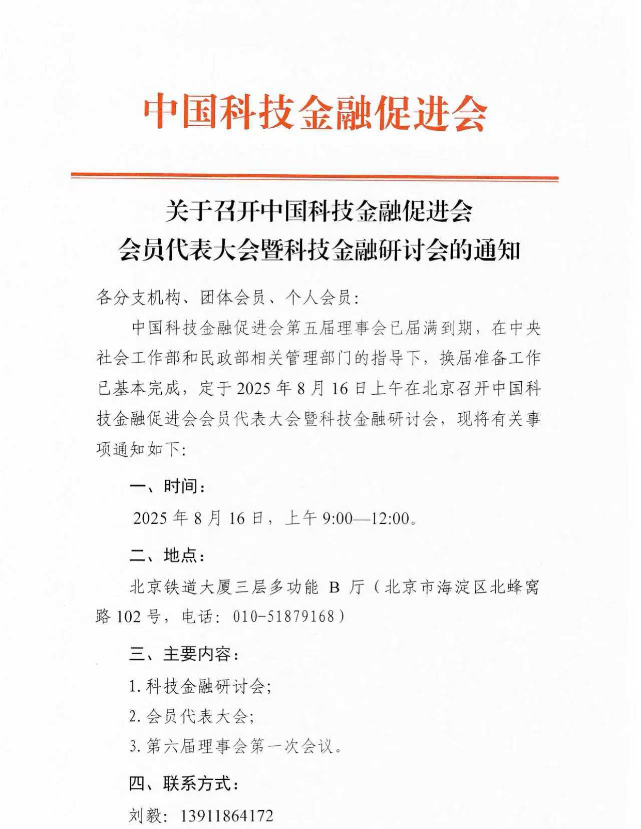 关于召开中国科技金融促进会 会员代表大会暨科技金融研讨会的通知