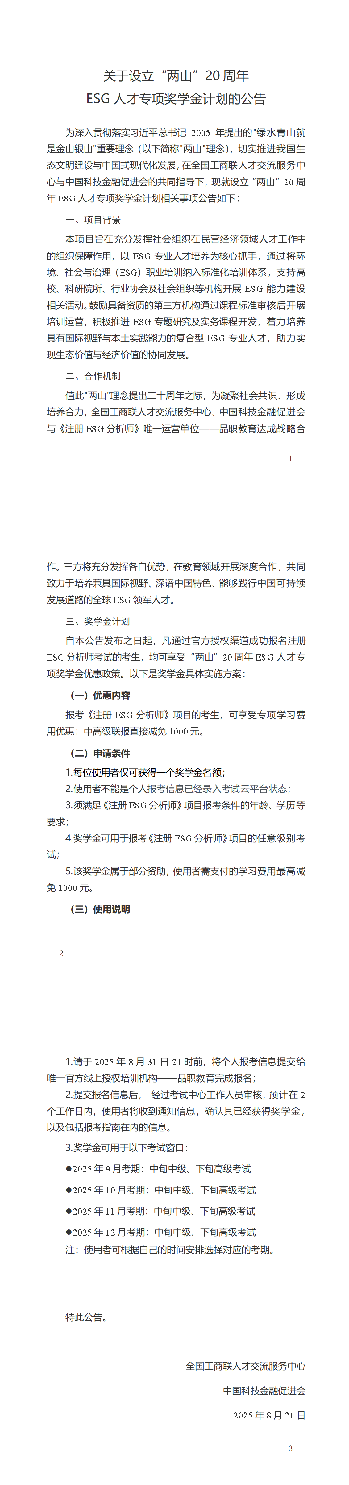 关于设立“两山”20周年ESG人才专项奖学金计划的公告