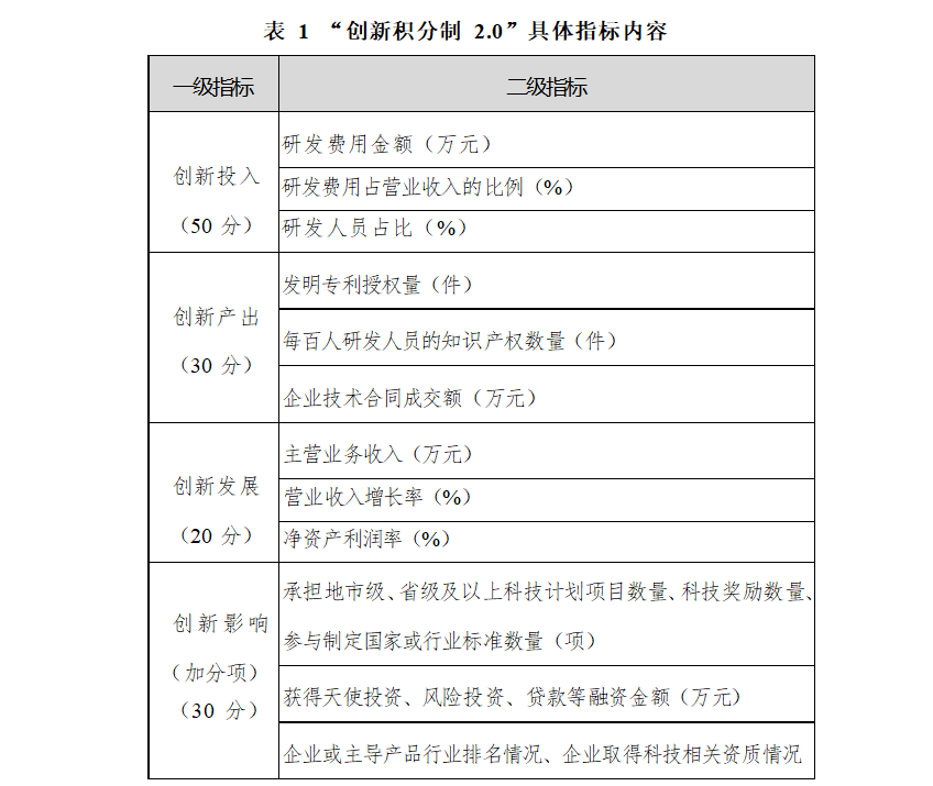 立足科技型企业的基本特征和评价目的,坚持指标体系“科学性、共识性、可比性、可采集性”的遴选原则,形成指标精简、导向清晰、操作性强的 “创新积分制2.0”指标体系架构。